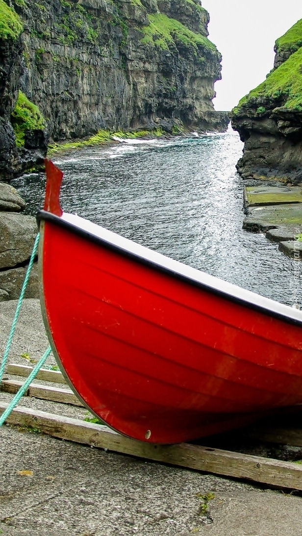 Edytor tapety: Czerwona łódka na skale