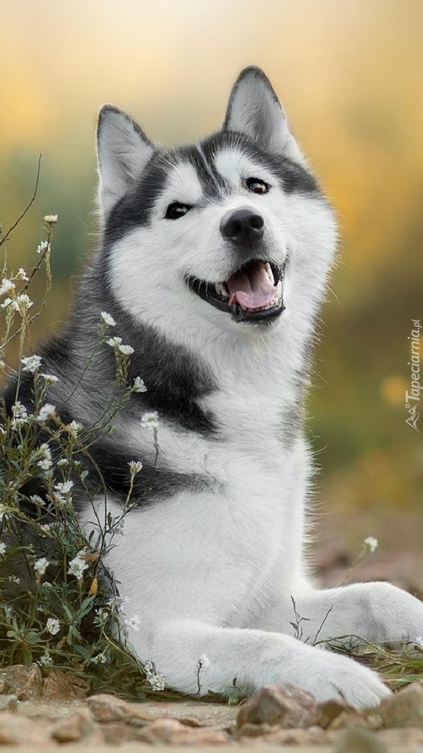 Edytor tapety: Siberian husky obok białych kwiatków
