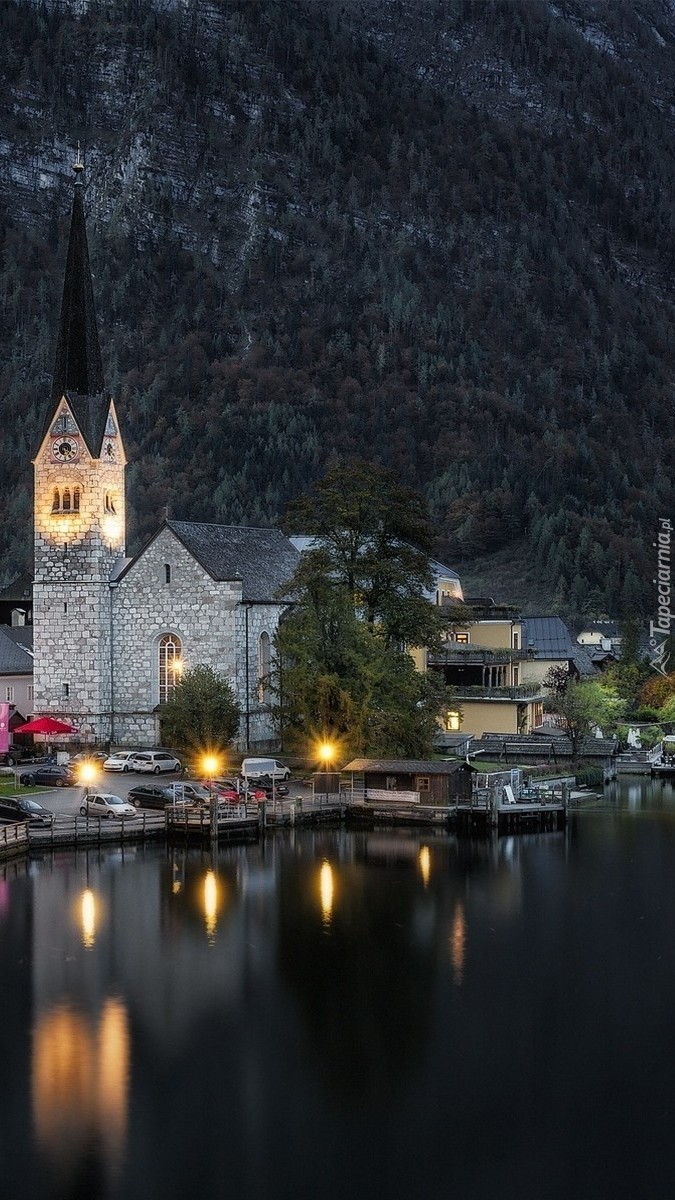 Edytor tapety: Kościół nad jeziorem w Hallstatt