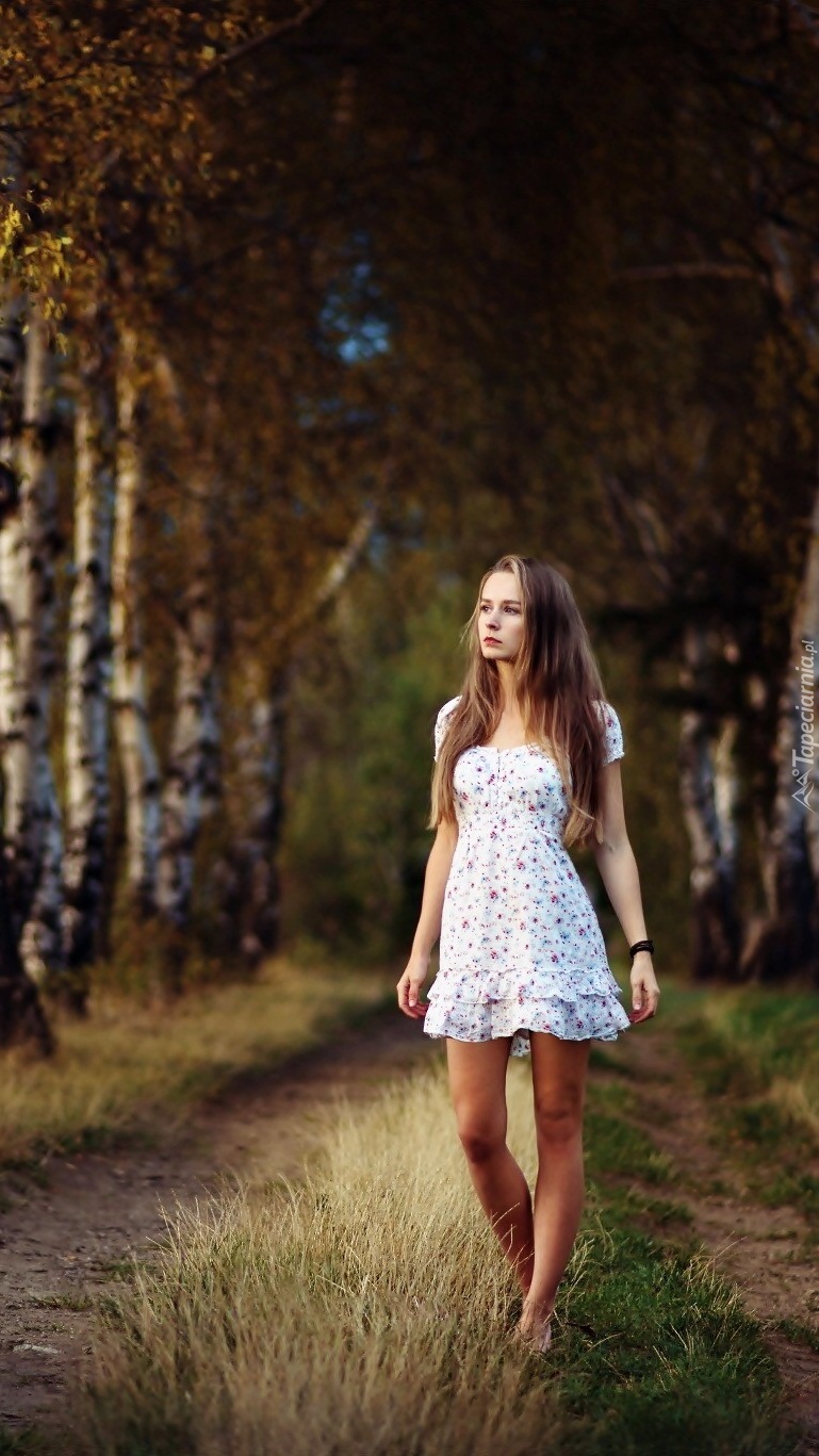 Edytor tapety: Kobieta na jesiennym spacerze w brzezinie