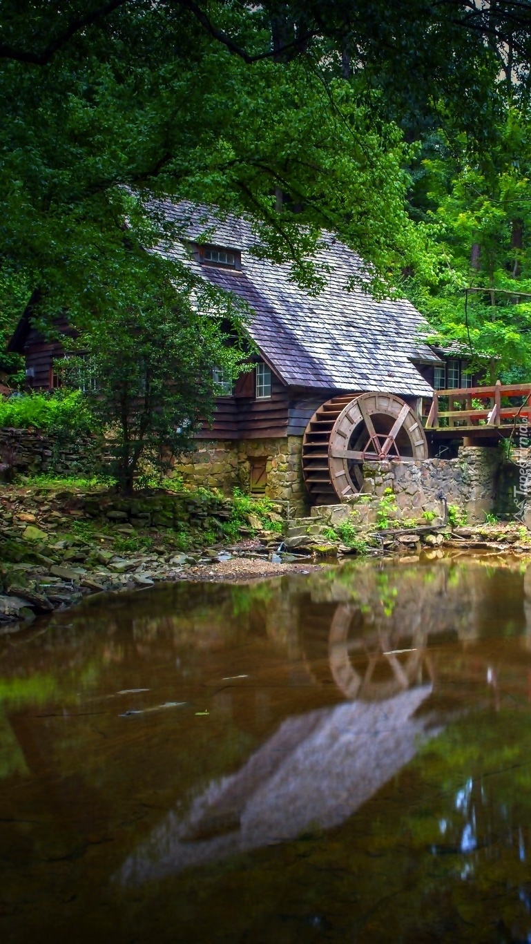 Edytor tapety: Stary młyn w lesie nad rzeką