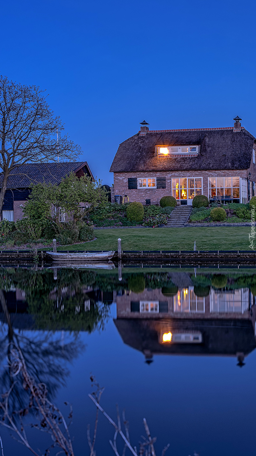 Edytor tapety: Dom nad rzeką o zmierzchu