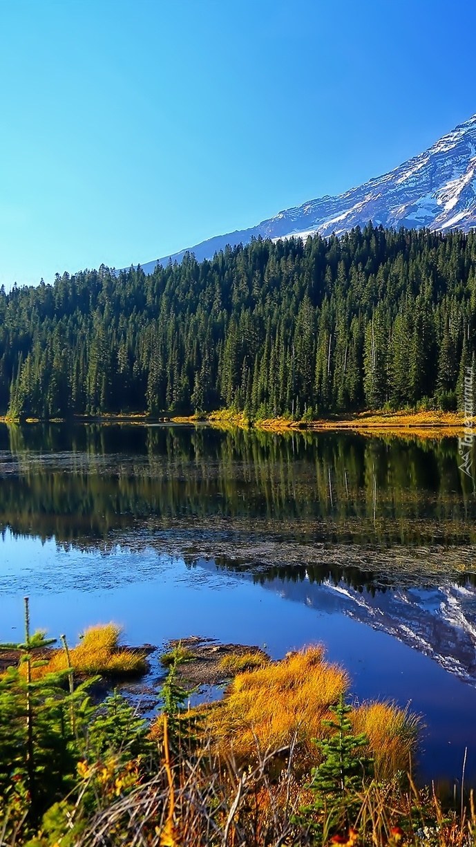 Edytor tapety: Jezioro otoczone lasem w górach