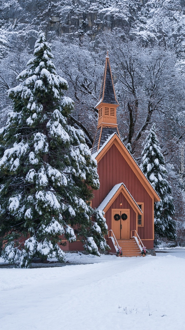 Edytor tapety: Kościółek pomiędzy ośnieżonymi drzewami