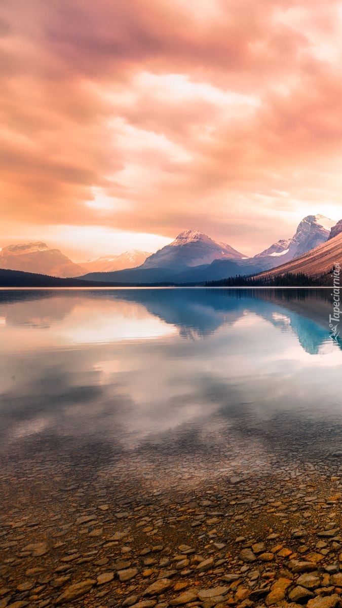 Edytor tapety: Kolorowe niebo nad górami i jeziorem