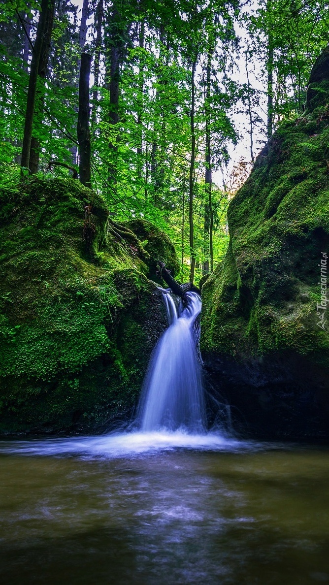 Edytor tapety: Wodospad między omszałymi głazami