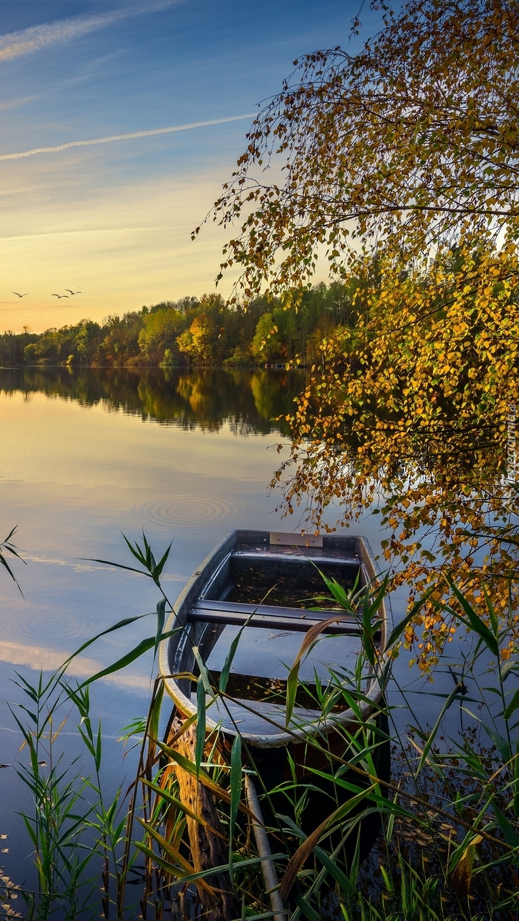Edytor tapety: Zacumowana łódka przy brzegu jeziora