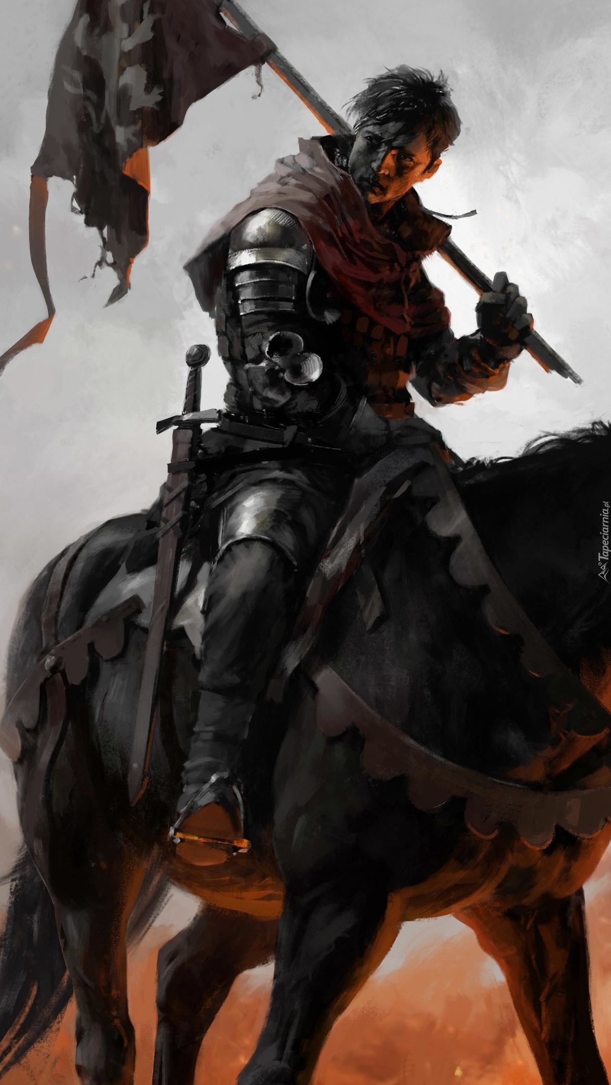 Edytor tapety: Rycerz na czarnym koniu z flagą