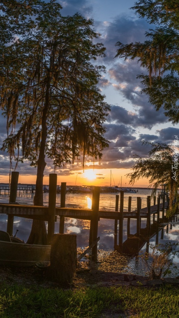 Edytor tapety: Pomost nad jeziorem o wschodzie słońca