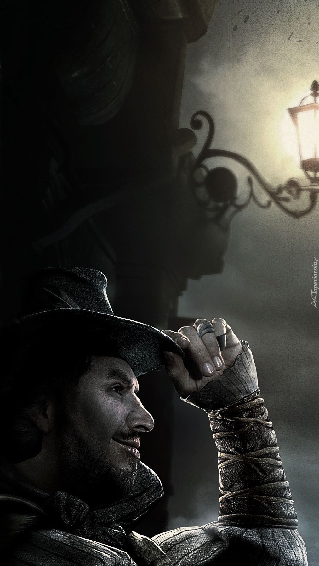 Edytor tapety: Mężczyzna w kapeluszu obok latarni