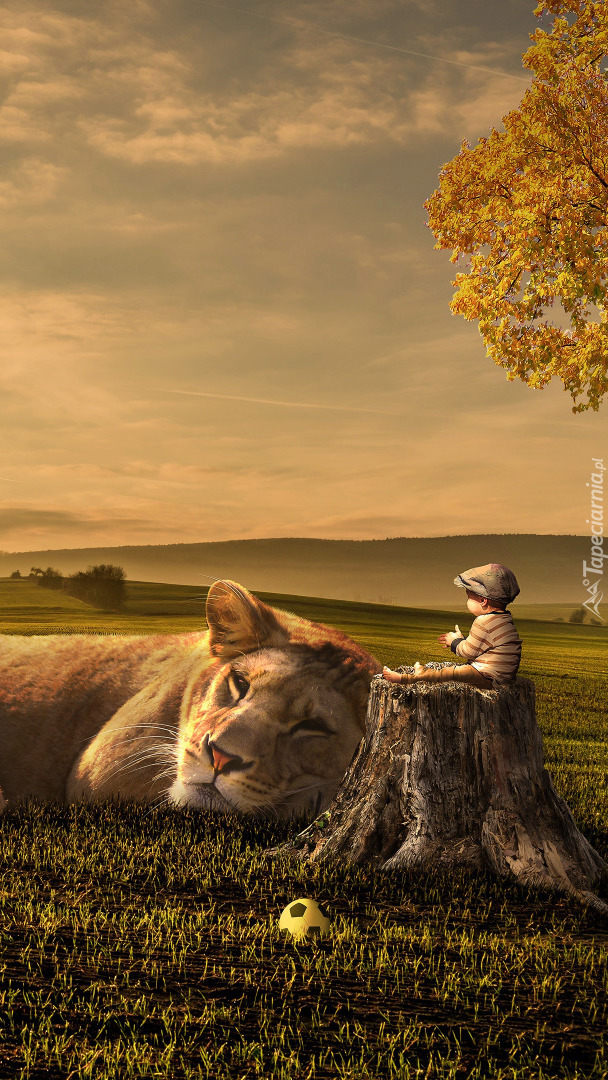 Edytor tapety: Leżący lew i chłopczyk na pieńku