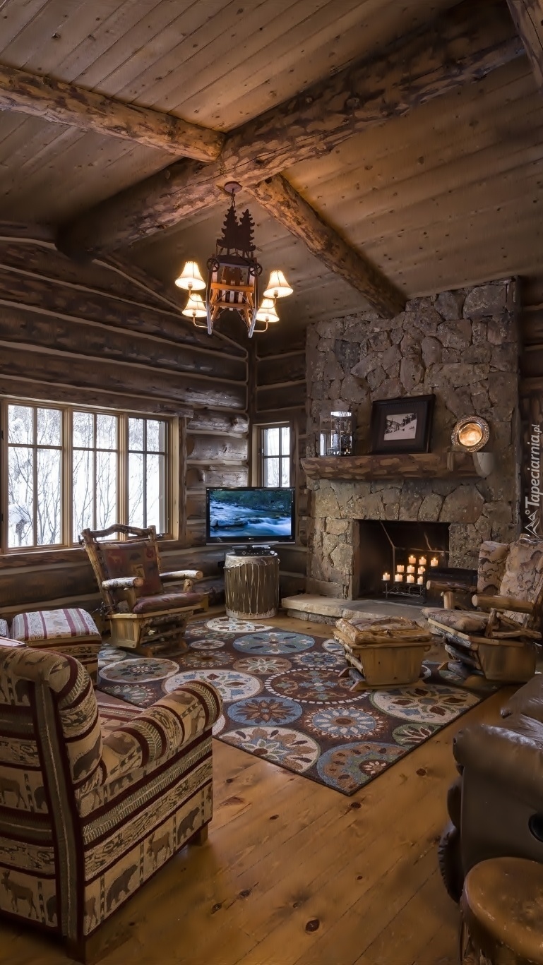 Edytor tapety: Salon z kominkiem i telewizorem