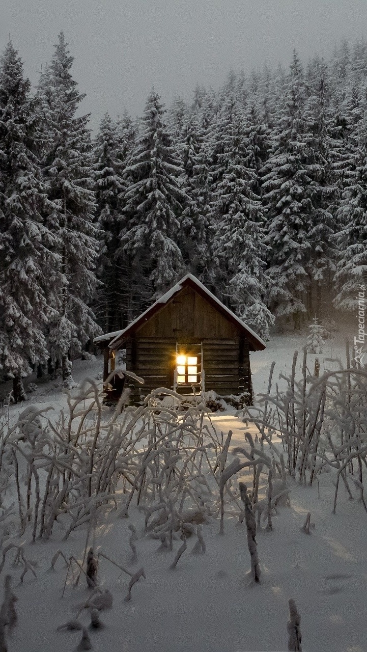 Edytor tapety: Domek zimą na ścianie lasu