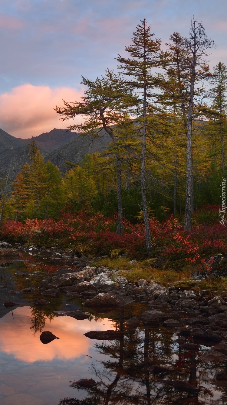 Edytor tapety: Drzewa rosnące przy jeziorze w górach