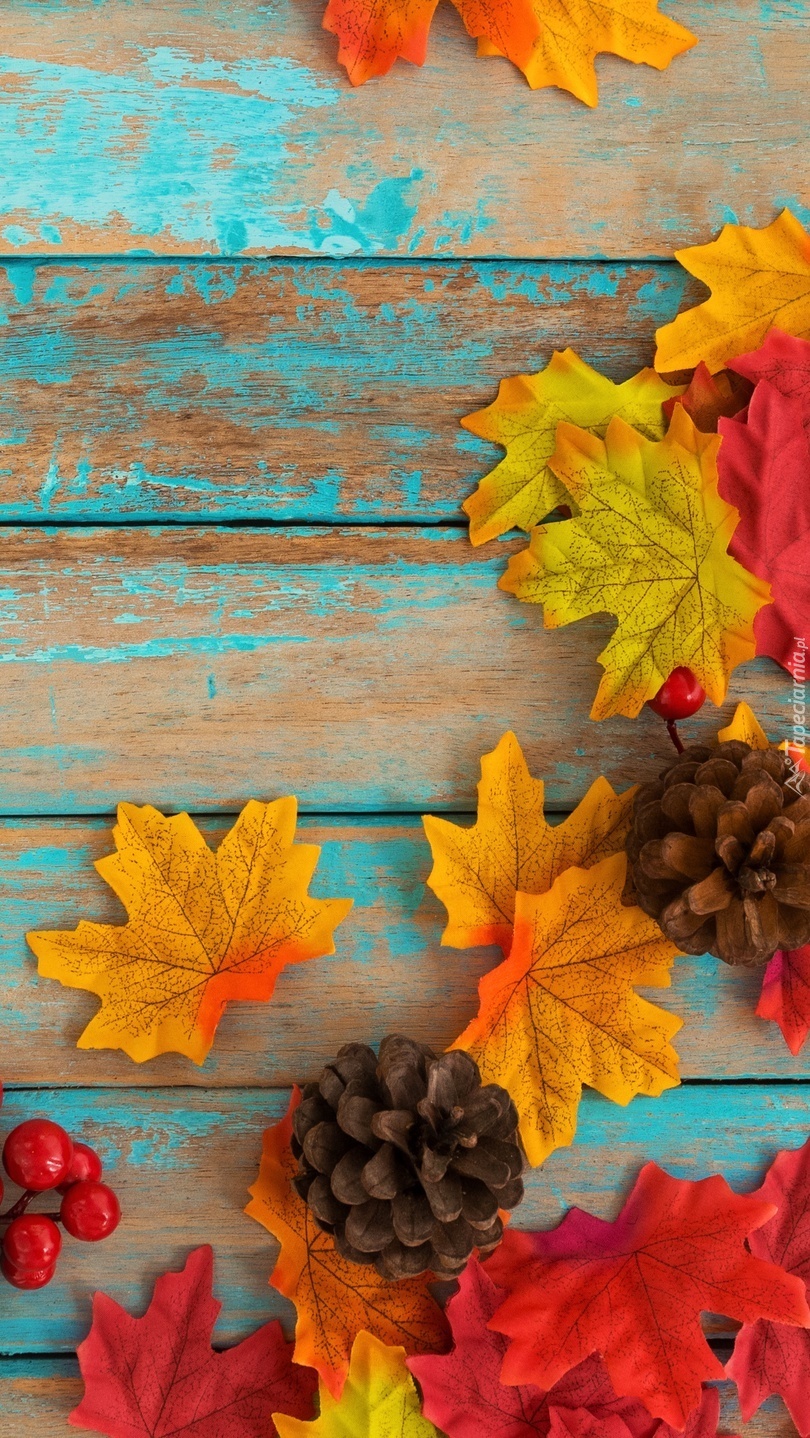 Edytor tapety: Szyszki i jesienne liście na deskach