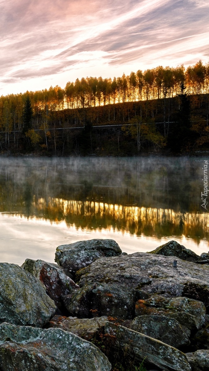 Edytor tapety: Kamienie i drzewa nad jeziorem