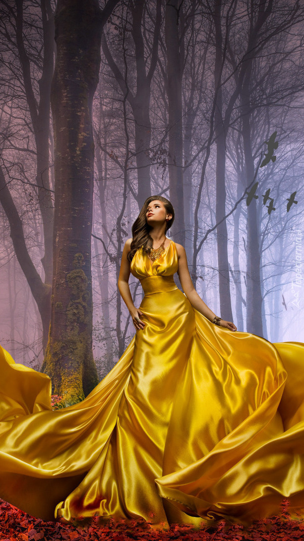 Edytor tapety: Kobieta w żółtej sukni w lesie