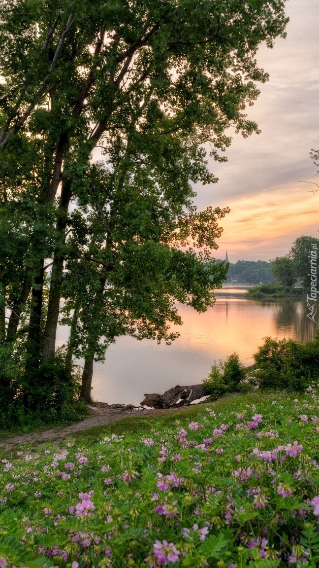 Edytor tapety: Fioletowe kwiaty nad rzeką