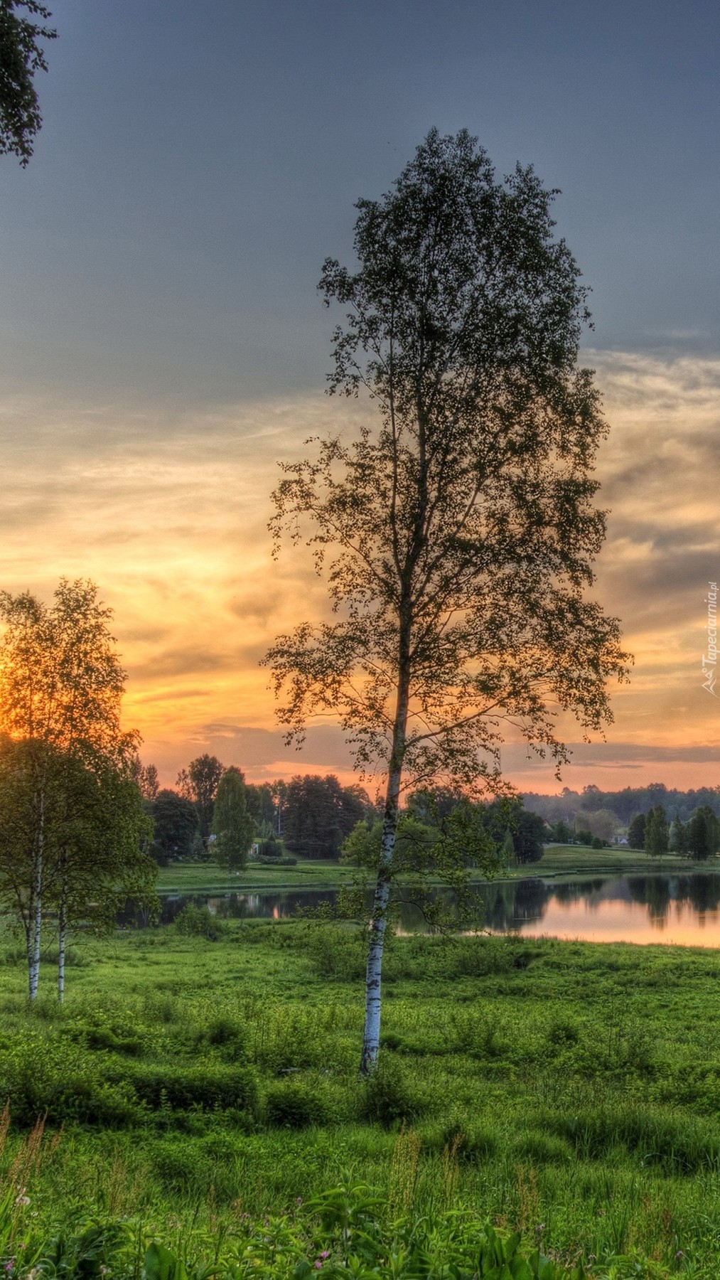 Edytor tapety: Młode brzózki nad stawem