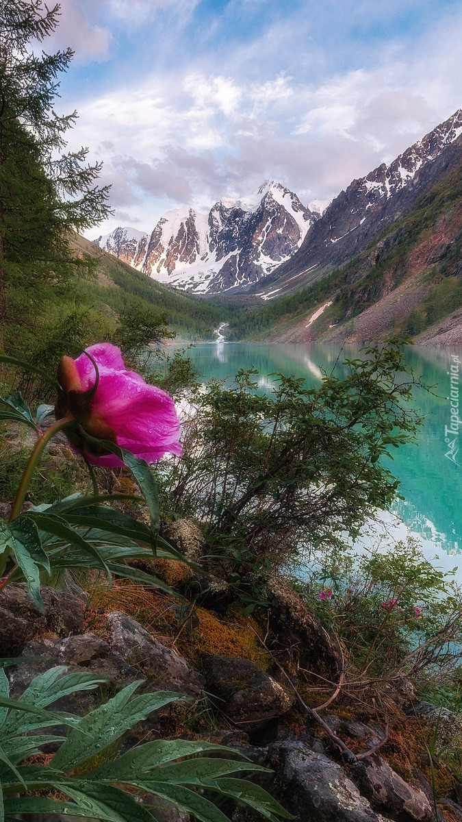 Edytor tapety: Piwonia na tle jeziora