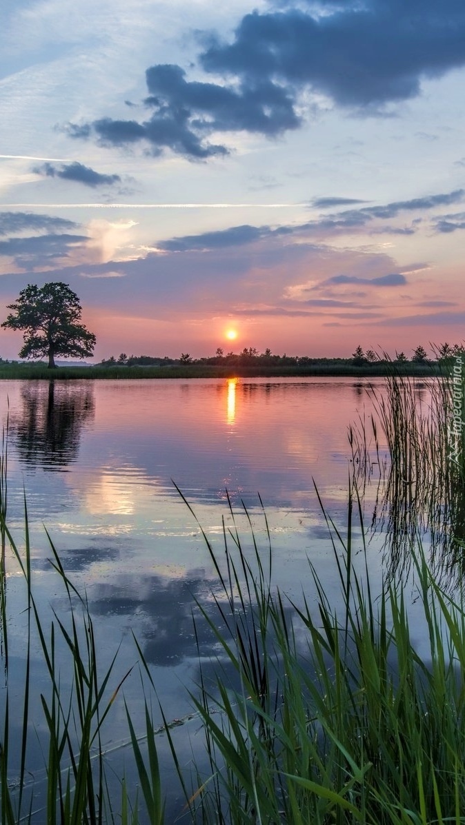 Edytor tapety: Jezioro porośnięte trawą o zachodzie słońca