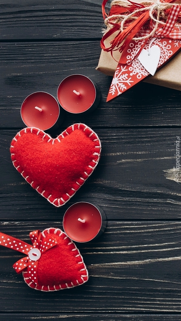 Edytor tapety: Czerwone serduszka obok świeczek i prezentu
