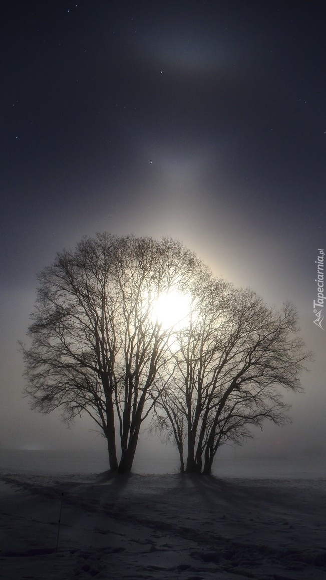 Edytor tapety: Zamglone drzewa o wschodzie słońca.