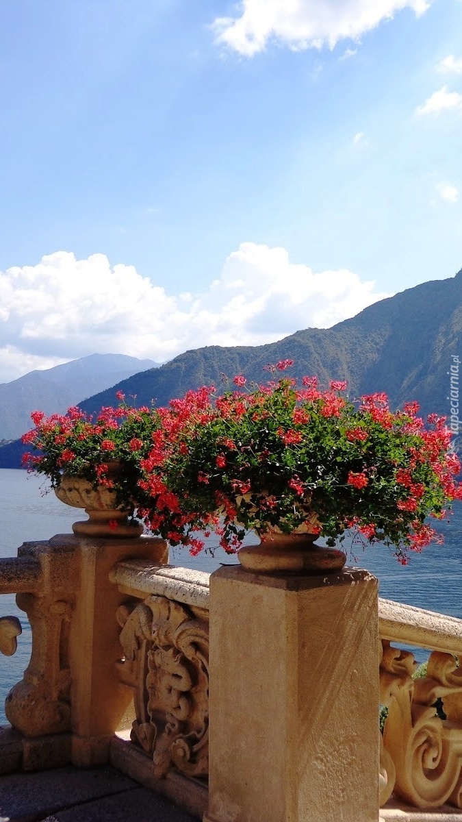 Edytor tapety: Taras z kwiatami nad górskim jeziorem