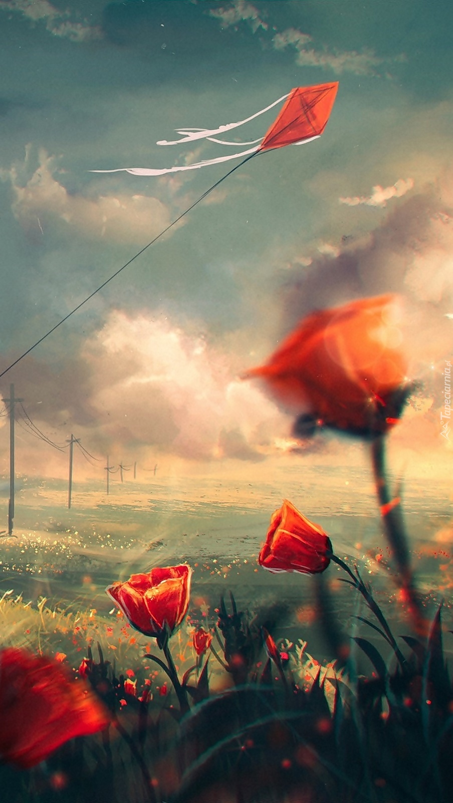 Edytor tapety: Latawiec nad łąką maków na obrazie
