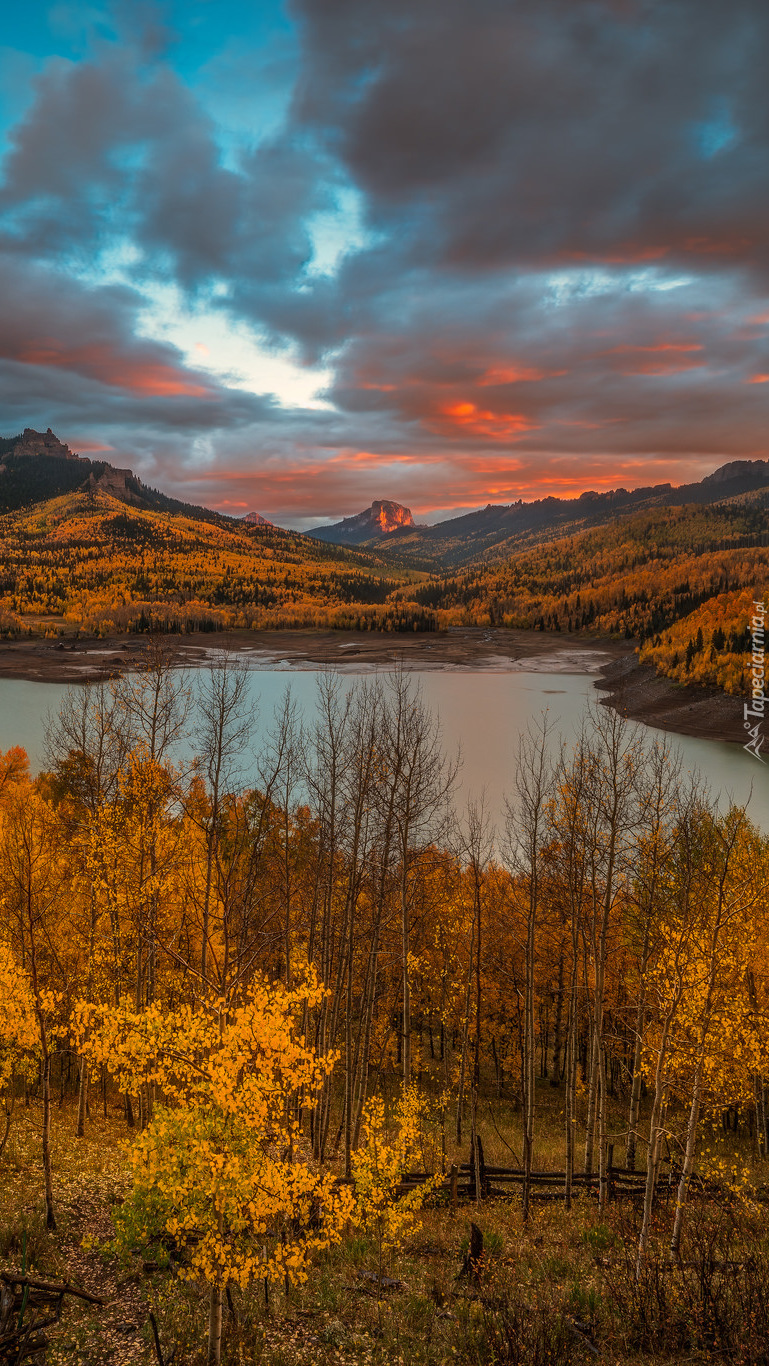 Edytor tapety: Jezioro z kolorowymi drzewami dookoła