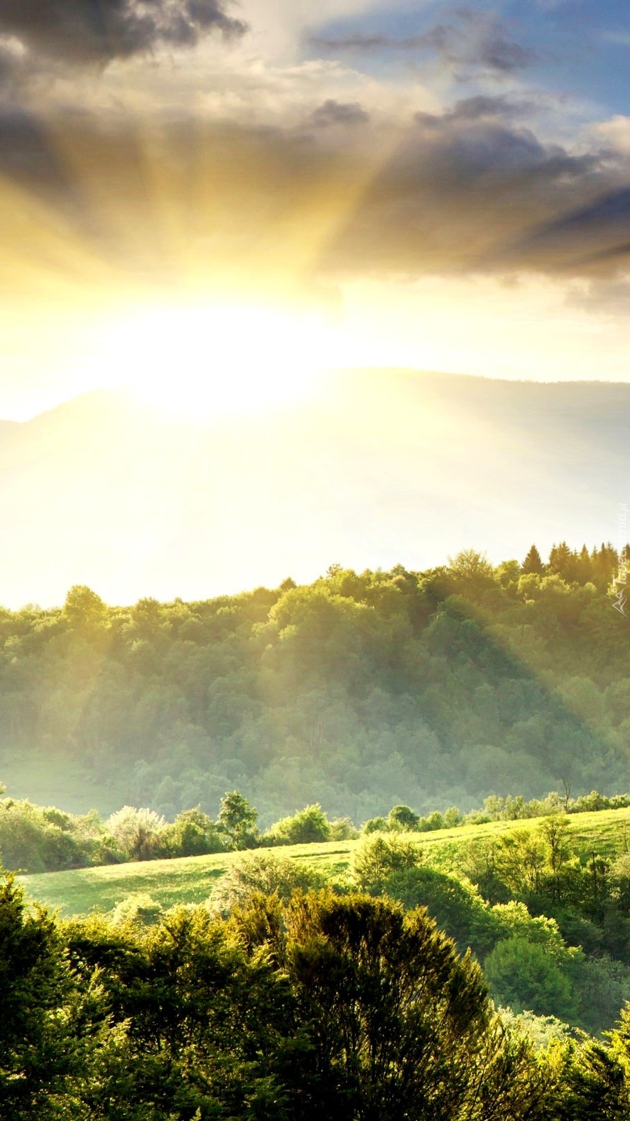 Edytor tapety: Wschód słońca nad górskimi lasami