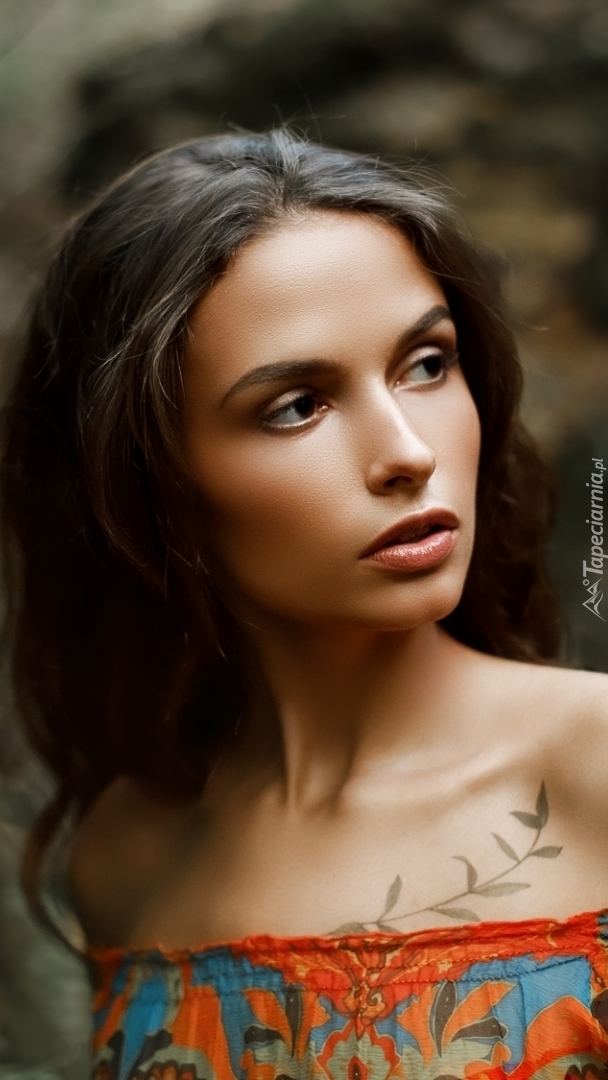 Edytor tapety: Szatynka w kolorowej bluzce z tatuażem