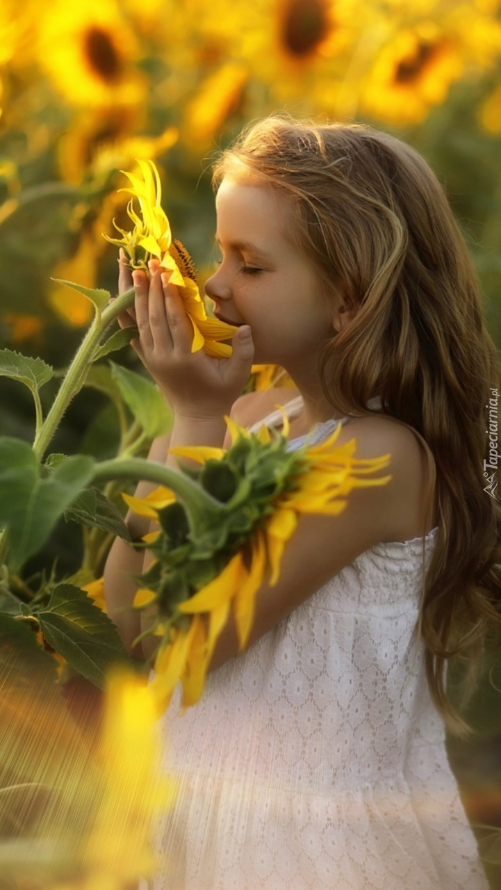 Edytor tapety: Dziewczynka na polu słoneczników