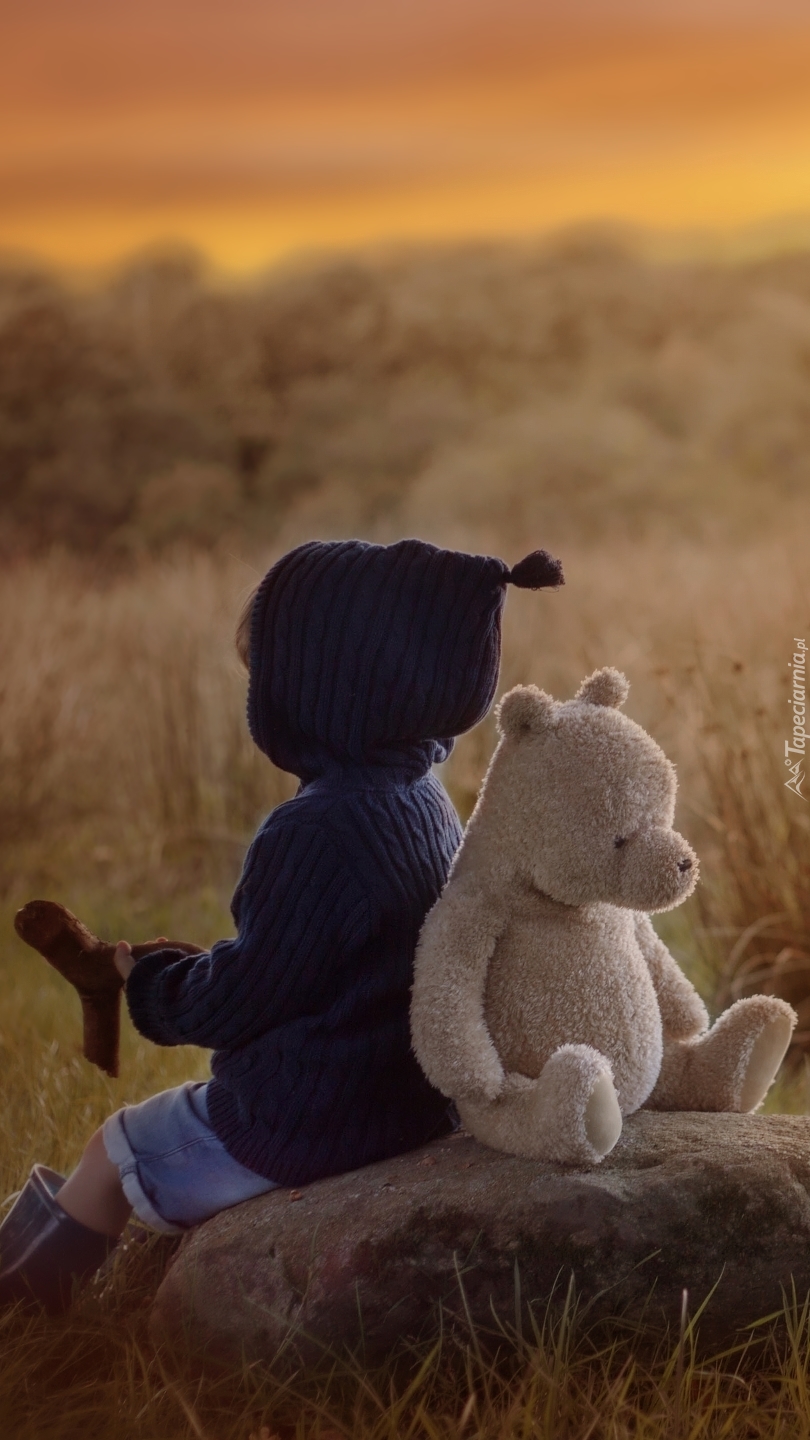 Edytor tapety: Dziecko z misiem na kamieniu