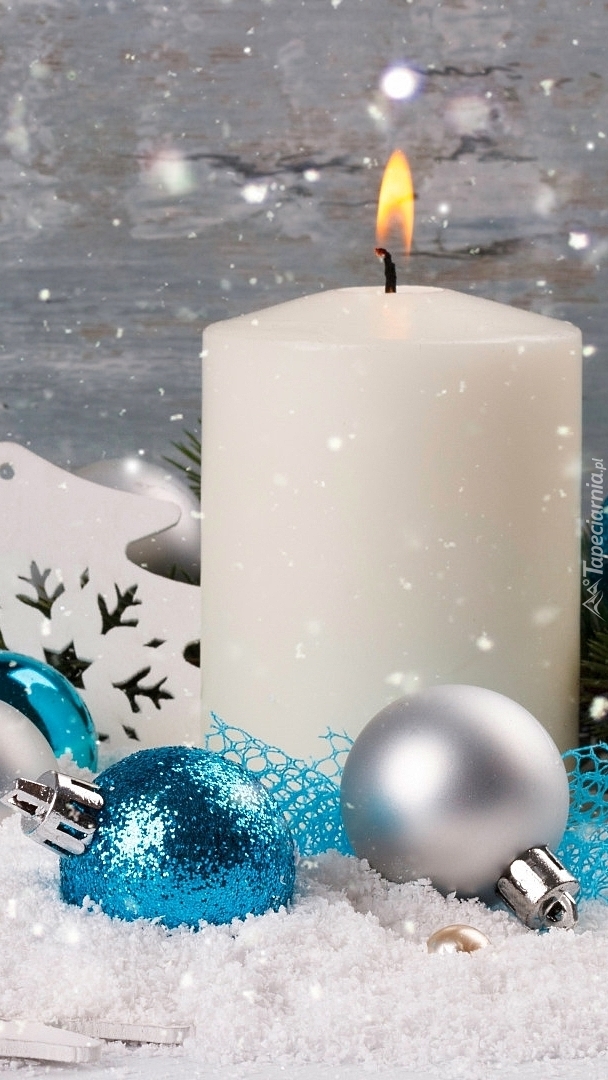 Edytor tapety: Świeca z bombkami w śniegu