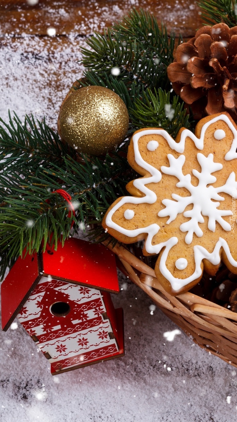 Edytor tapety: Ozdobione gałązki świerkowe w koszyku