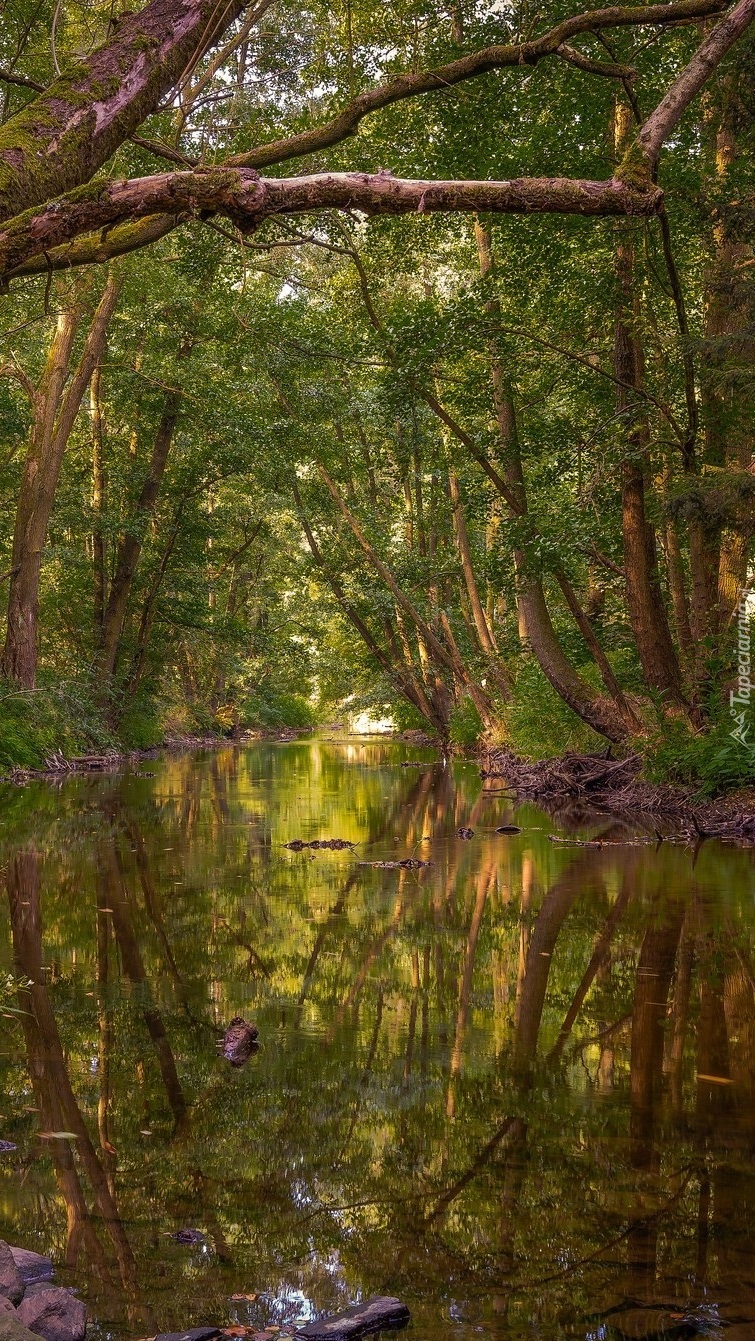 Edytor tapety: Drzewa nad rzeką i ich odbicie