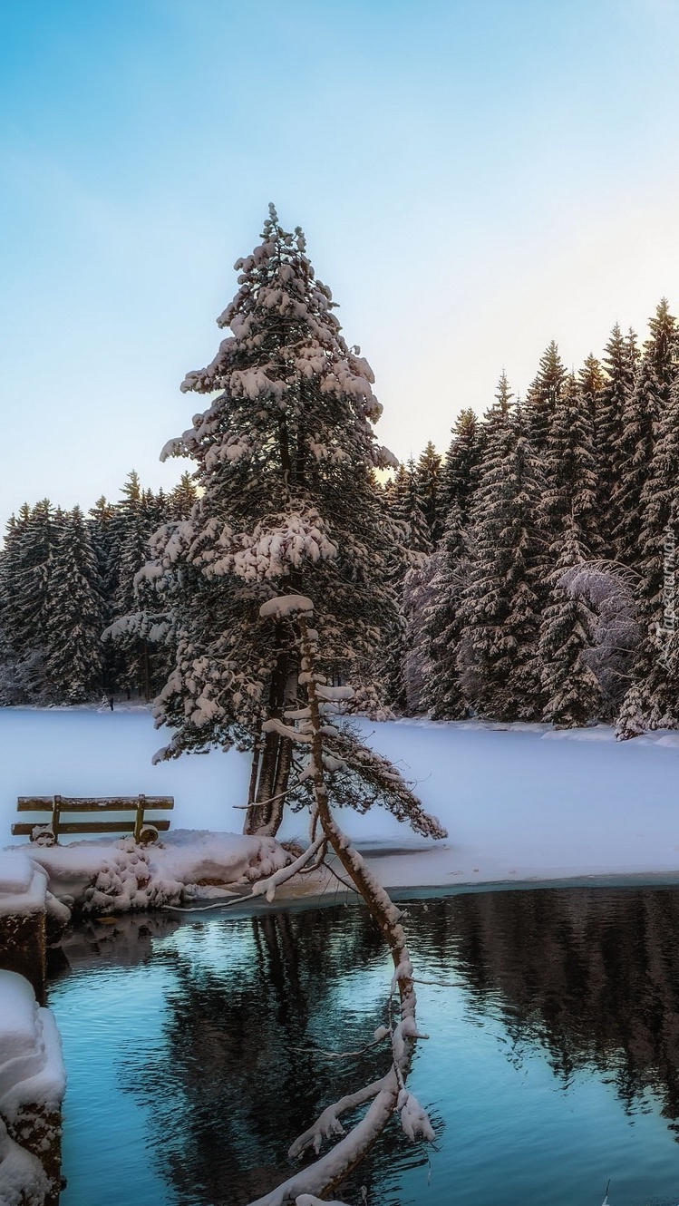 Edytor tapety: Zaśnieżona ławeczka pod drzewem