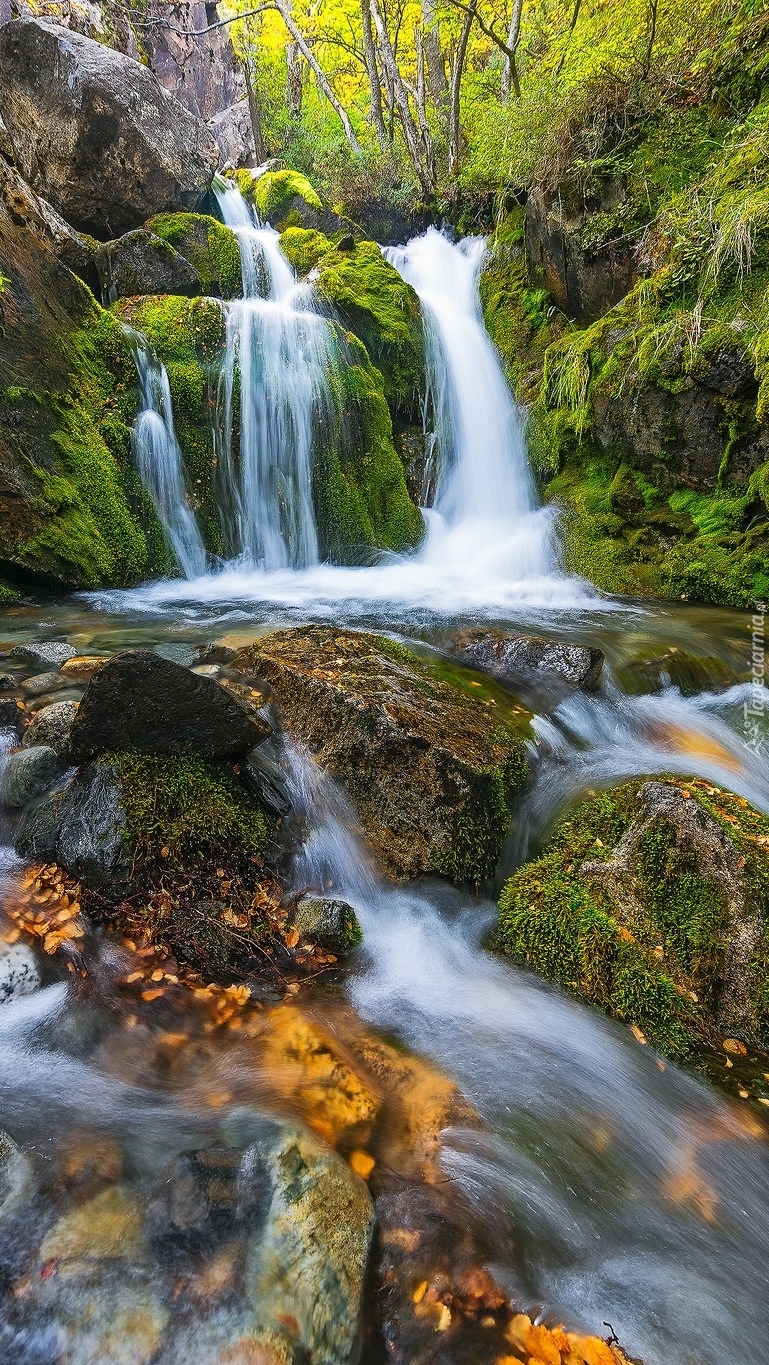 Edytor tapety: Wodospad i omszałe kamienie