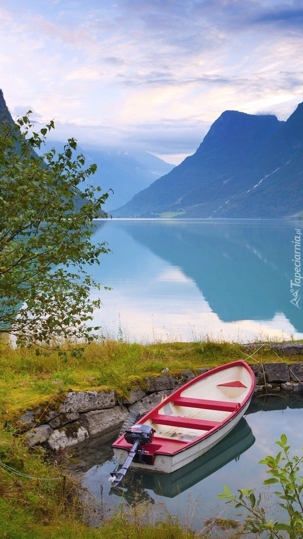 Edytor tapety: Łódka przy brzegu jeziora