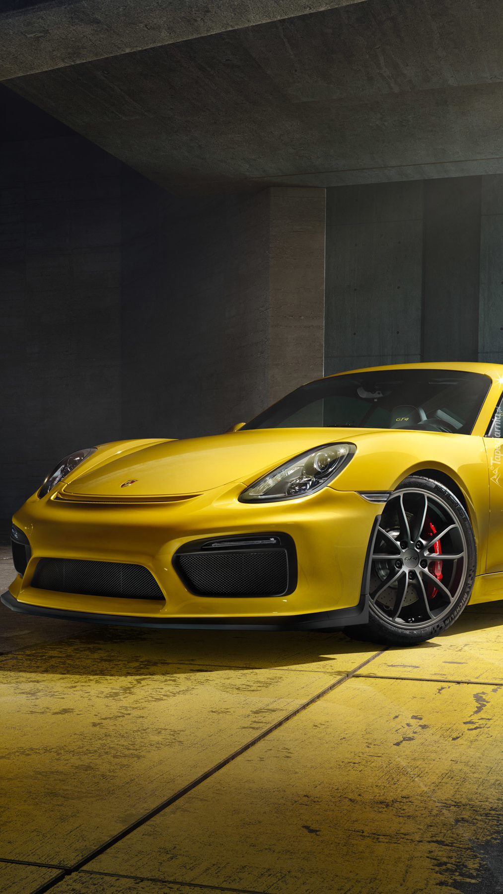 Edytor tapety: Żółte Porsche Cayman GT4 w garażu