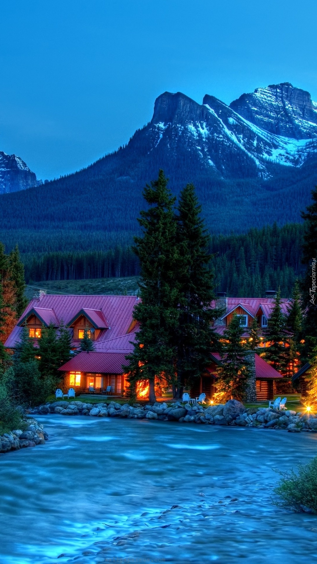 Edytor tapety: Domy nad rzeką o zmierzchu