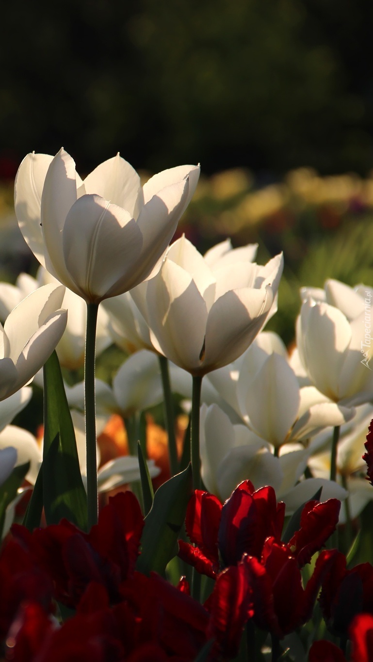 Edytor tapety: Białe i czerwone tulipany w słońcu