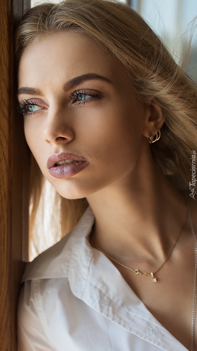 Edytor tapety: Zapatrzona blondynka przy oknie