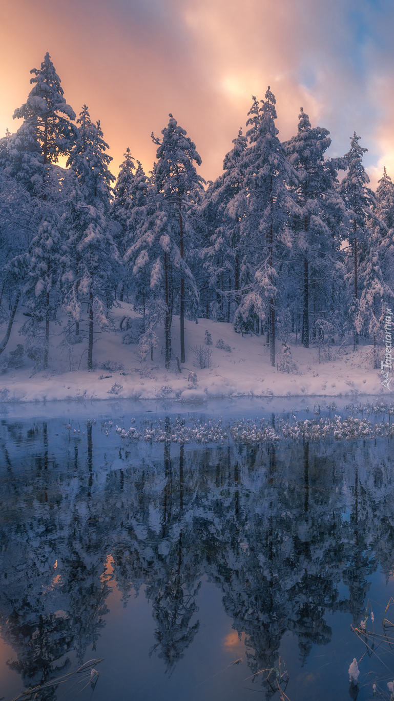 Edytor tapety: Zimowy las nad jeziorem