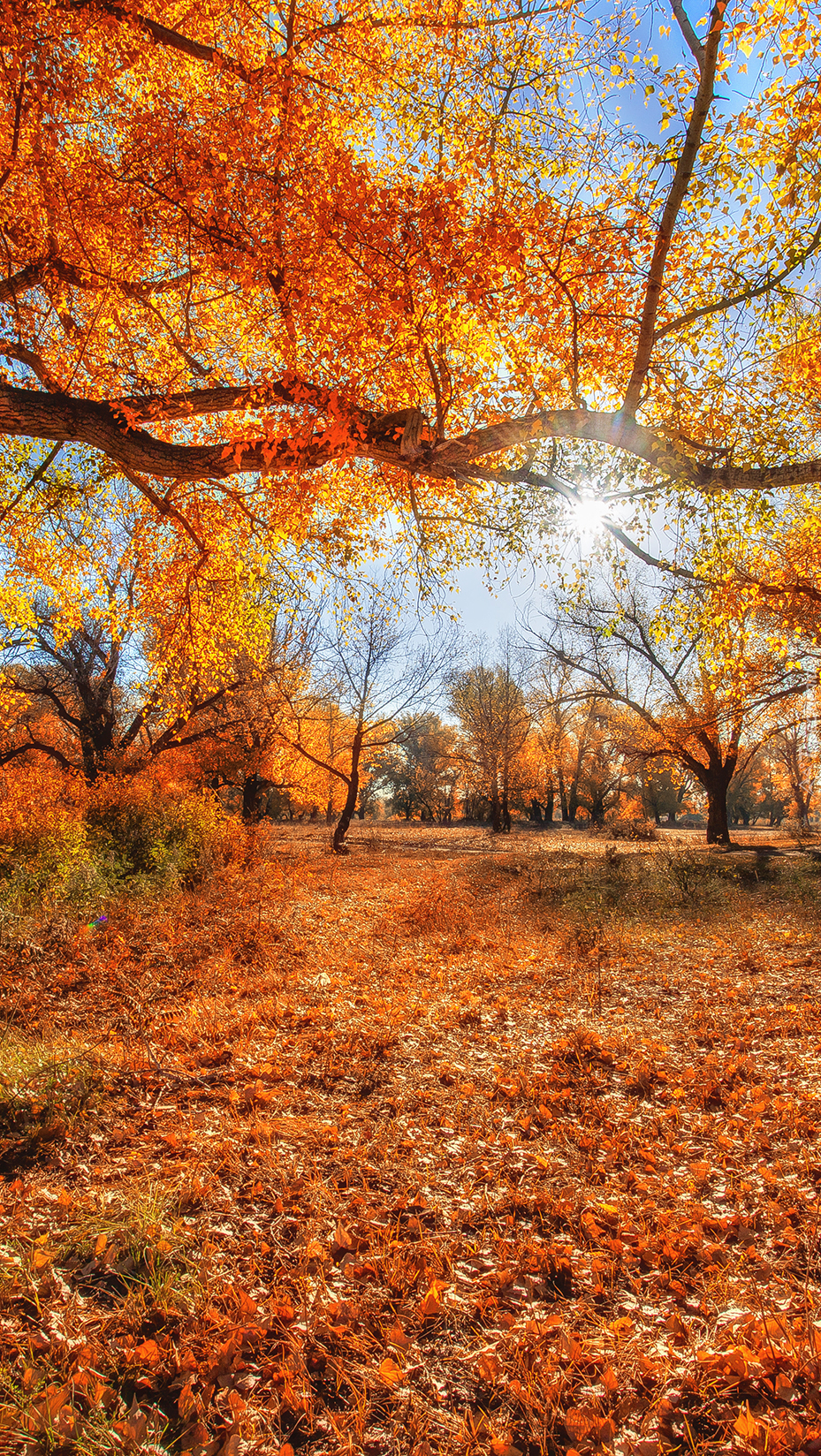 Edytor tapety: Promienie słońca w jesiennych drzewach