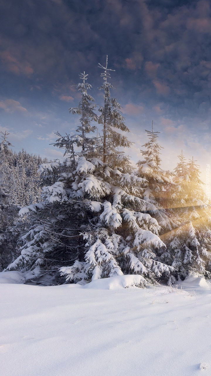 Edytor tapety: Promienie słońca padające na ośnieżone świerki