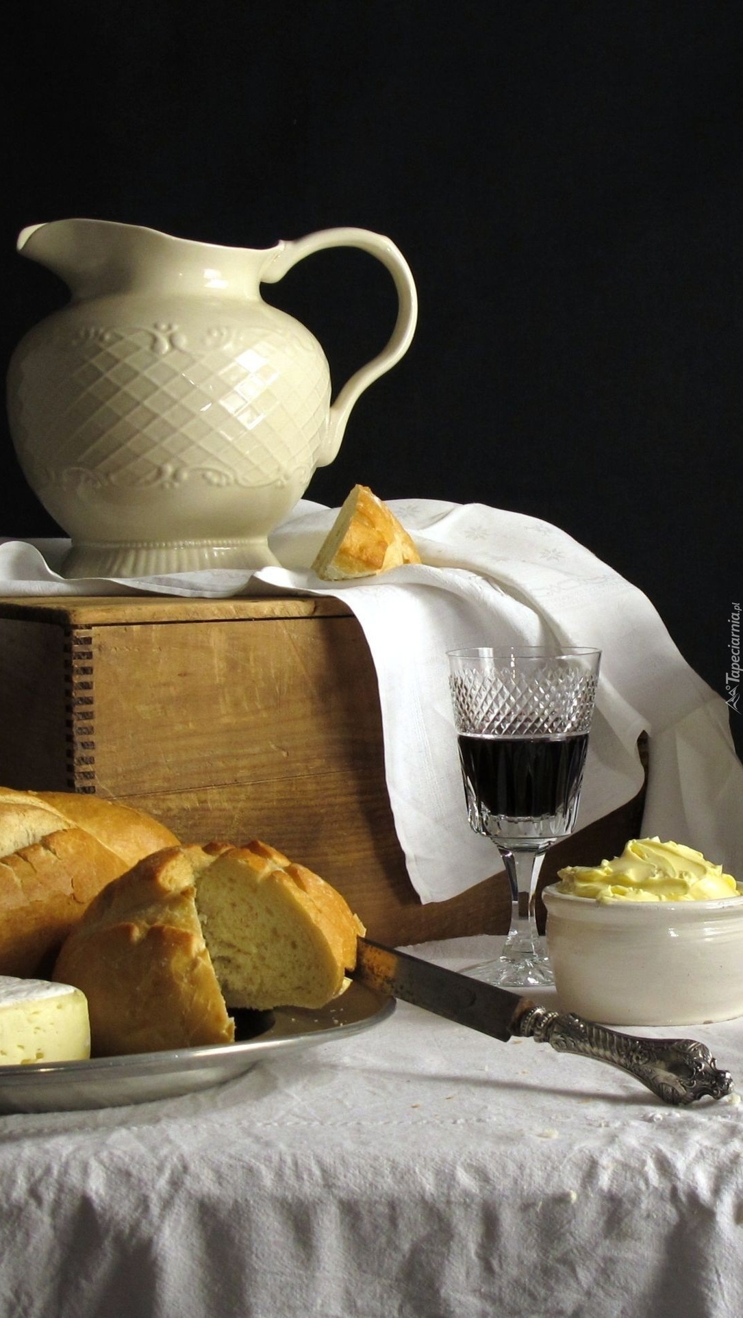 Edytor tapety: Pieczywo i masło przy lampce wina