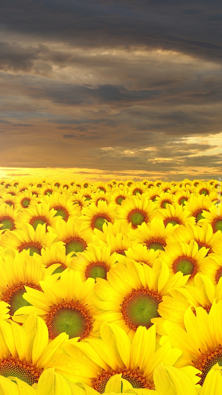 Edytor tapety: Ciemne chmury nad plantacją słoneczników