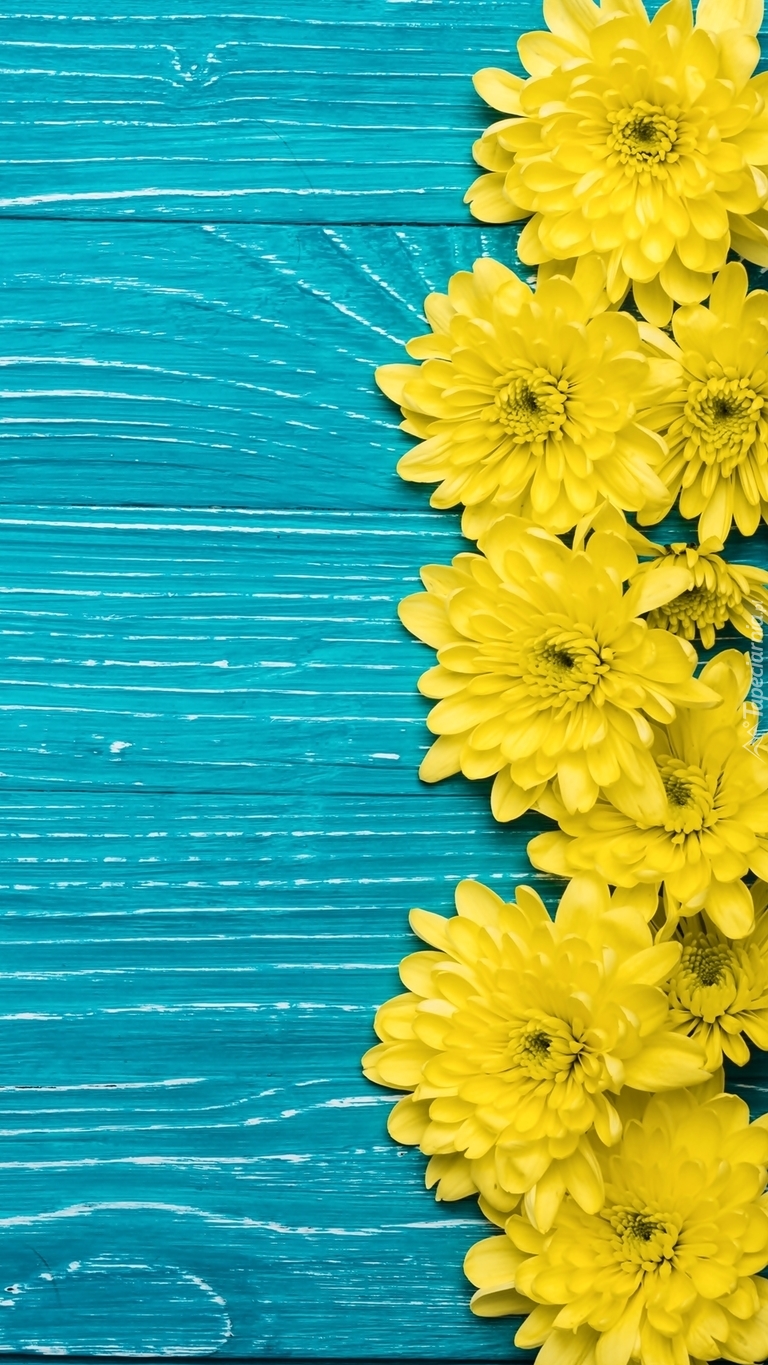 Edytor tapety: Żółte chryzantemy na turkusowych deskach